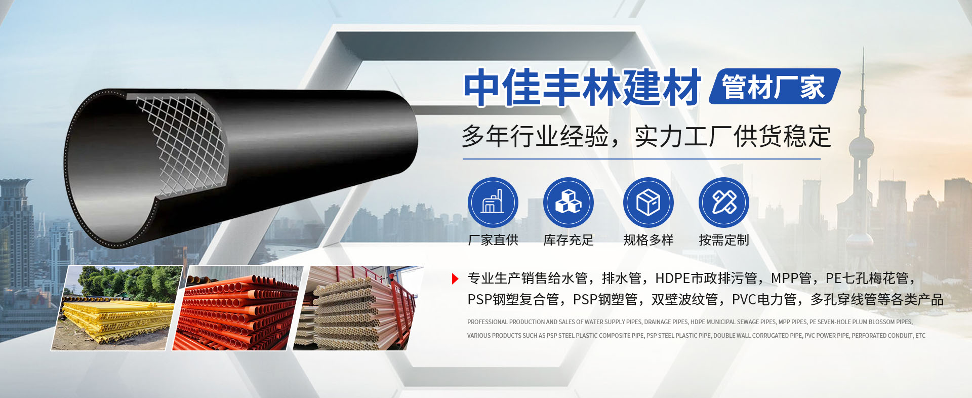 四川中佳丰林建材有限公司是集市政管材设计、生产、销售安装于一体的实力厂家,专业生产销售给水管,排水管,HDPE市政排污管,MPP管,PE七孔梅花管,PSP钢塑复合管,PSP钢塑管,双壁波纹管,PVC电力管,多孔穿线...